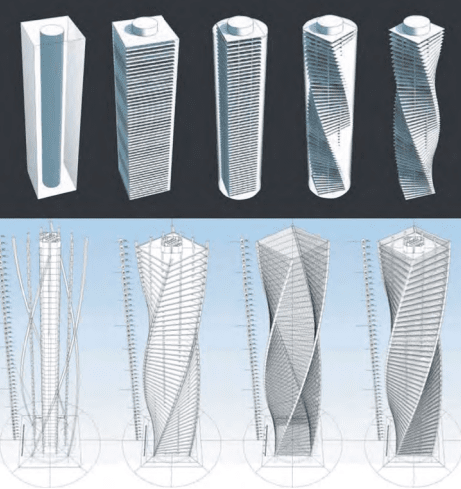Este diseño simple e innovador se basó en los principios de torcer placas de piso de forma cuadrada con un marco vertical de hormigón armado, sostenido por un núcleo central y ocho columnas en una disposición octogonal, con vigas continuas y cuatro columnas en espiral en las esquinas.