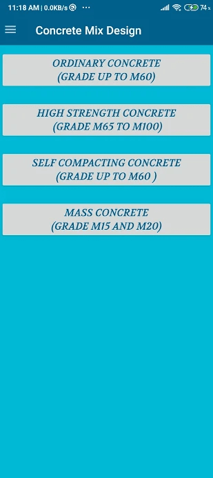 La aplicación Concrete Design tiene las siguientes funcionalidades: El hormigón normal incluye varios tipos de cemento, como PPC, OPC 33, OPC 43 y OPC 53.