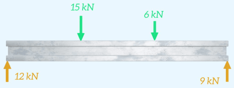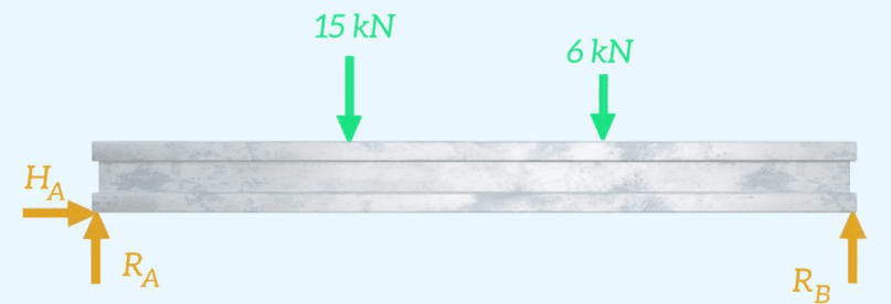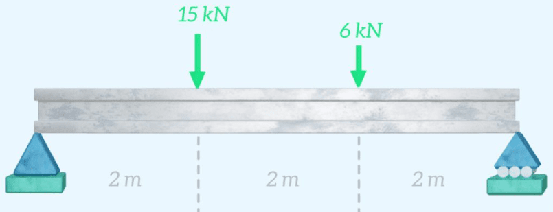 En este ejemplo, determinaremos el diagrama de fuerza cortante y momento flector para una viga simplemente apoyada que soporta dos cargas.