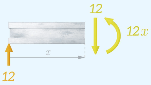 Como se mencionó en una parte anterior de este artículo, si hacemos un corte imaginario a través de la viga en cualquier lugar, las fuerzas y momentos internos que actúan sobre la sección transversal cortada deben equilibrar las fuerzas y momentos externos. Esto significa que podemos aplicar una vez más las ecuaciones de equilibrio para calcular las fuerzas cortantes y los momentos flectores a lo largo de la viga.