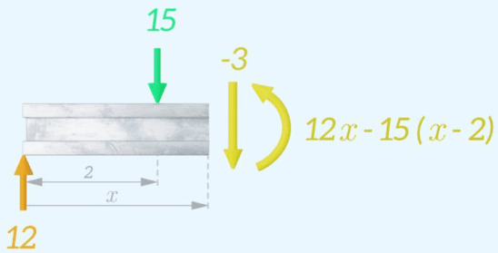 Luego se repite el proceso, moviendo la ubicación del corte imaginario más hacia la derecha. Esta vez el corte se coloca inmediatamente después de la fuerza de 15 kN y se dibuja el diagrama de cuerpo libre. La fuerza cortante y el momento flector se pueden calcular aplicando las ecuaciones de equilibrio.