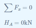 A continuación, debemos aplicar las ecuaciones de equilibrio para determinar las fuerzas de reacción desconocidas en el punto A y el punto B. La suma de las fuerzas en la dirección horizontal debe ser cero. Ha es la única fuerza en la dirección horizontal, por lo que debe ser igual a cero: