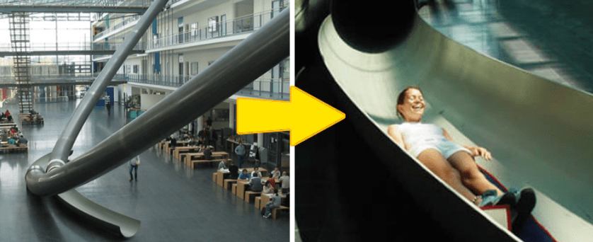 «Estos toboganes gemelos están instalados en el atrio del edificio de la Universidad. Comenzando desde el piso superior, los toboganes son la manera perfecta para que los estudiantes demasiado cansados o con prisa lleguen al piso inferior.«