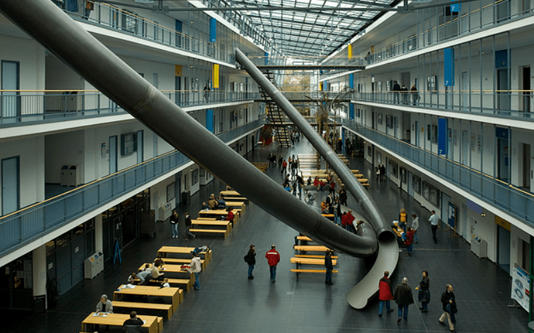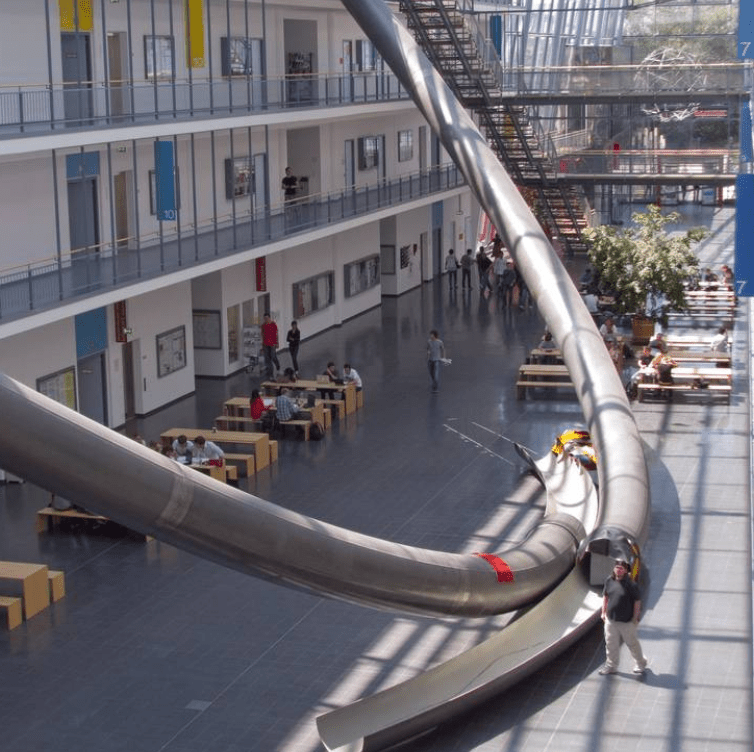 De acuerdo con la ley alemana, una parte del presupuesto de cada instalación debe destinarse al arte, por lo que estos toboganes son en realidad una instalación de arte, una instalación de arte que proporciona una increíble descarga de adrenalina, que seguramente como estudiante universitario debes descargar conforme pasa el ciclo académico.